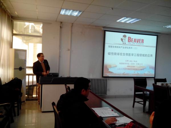 12月26日海貍納米走進(jìn)山東大學(xué)生命科學(xué)院,舉辦了“海貍生物納米產(chǎn)業(yè)”全國巡回首場(chǎng)講座。此次活動(dòng)由山東大學(xué)微生物技術(shù)國家重點(diǎn)實(shí)驗(yàn)室陳秀蘭教授主辦,海貍授權(quán)經(jīng)銷商濟(jì)南格非生物技術(shù)有限公司聯(lián)合承辦,任輝博士主講。