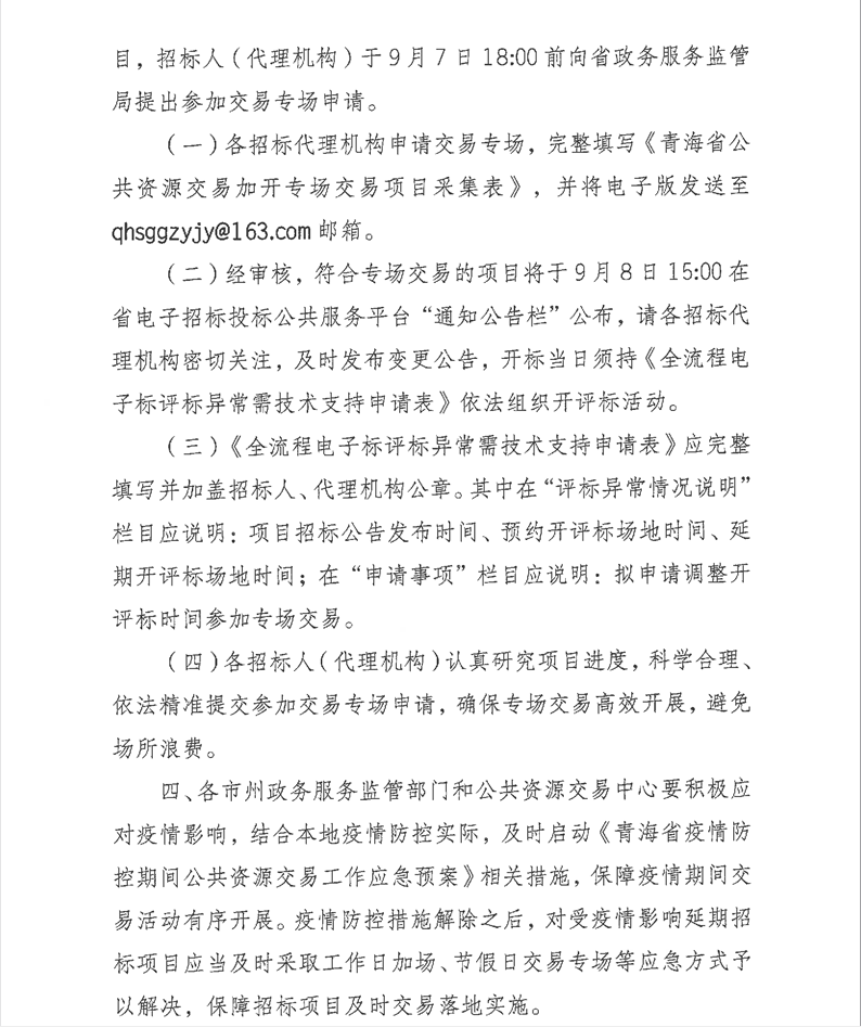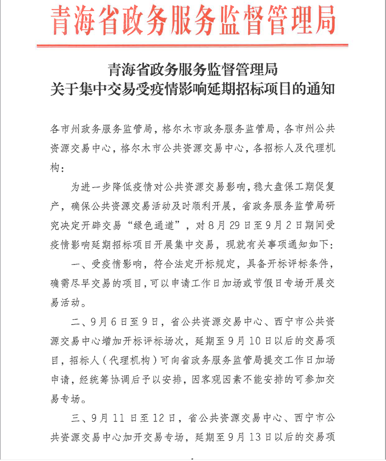 青海省政務(wù)服務(wù)監(jiān)督管理局關(guān)于集中交易受疫情影響延期招標(biāo)項(xiàng)目的通知