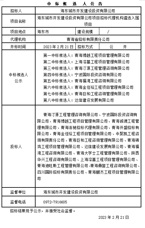 海東城市開發(fā)建設(shè)投資有限公司項(xiàng)目招標(biāo)代理機(jī)構(gòu)遴選入圍項(xiàng)目中標(biāo)候選人公示