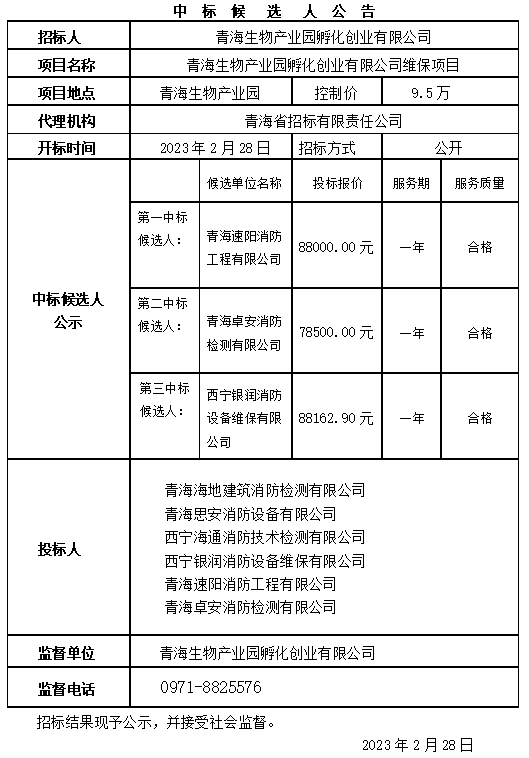 青海生物產(chǎn)業(yè)園孵化創(chuàng)業(yè)有限公司維保項(xiàng)目中標(biāo)候選人公示